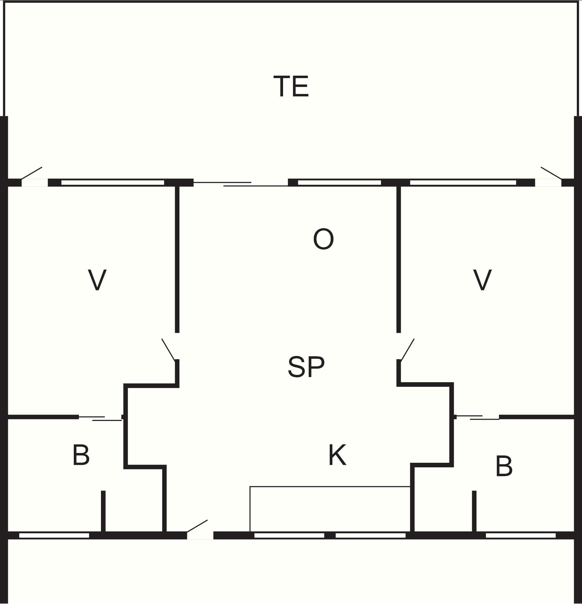 Dette kysthus er indrettet med entre og fordelingsgang samt to soveværelser, hvoraf det ene er med dobbeltseng. Det andet værelse i huset indeholder to enkeltsenge samt to køjesenge. Husene indeholder derudover en stor lys stue med brændeovn samt et stort køkken-alrum med spiseplads. Der er fra stuen direkte adgang til den store overdækkede terasse. I disse typer er der to badeværelser i boligen.