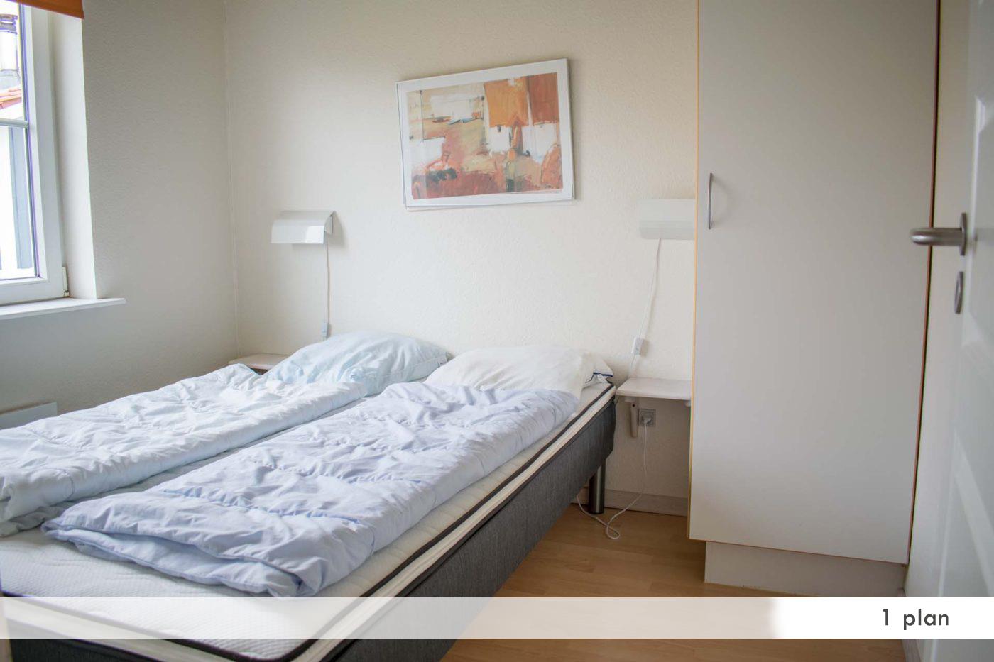 1 soverum med dobbeltseng. Gæstetoilet.El-varme og moderne møblering.