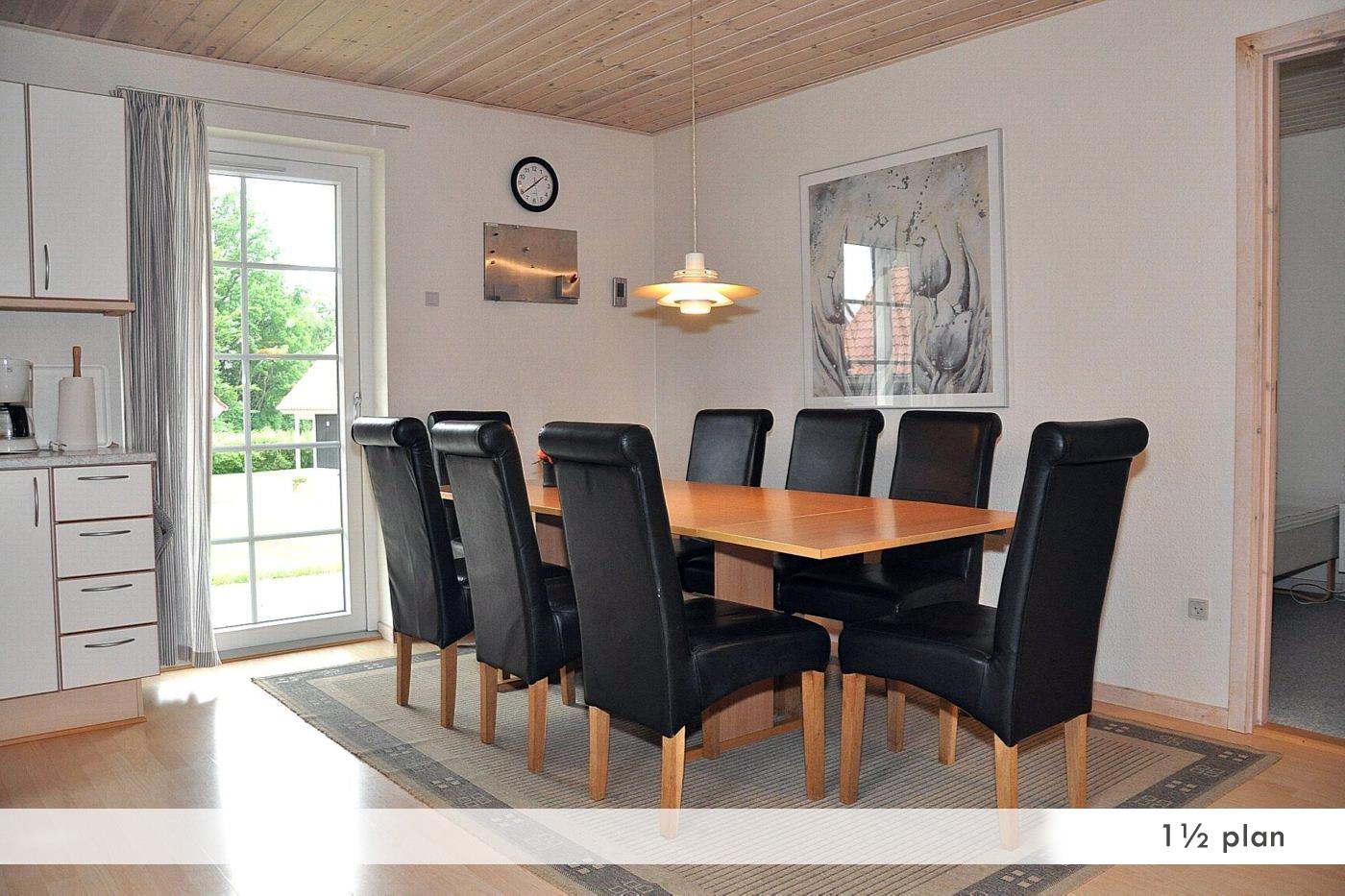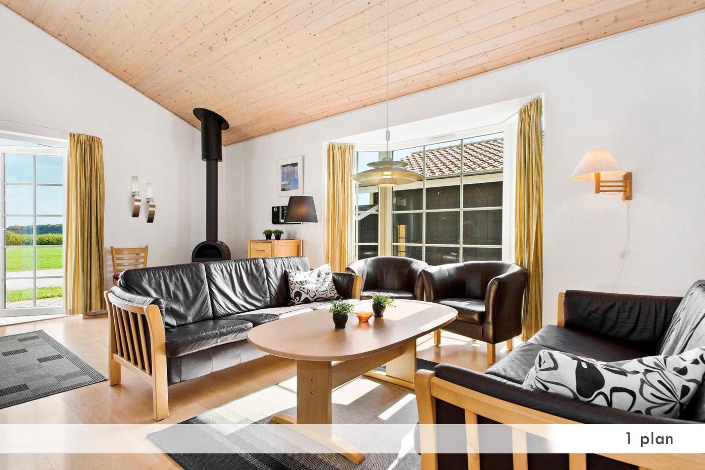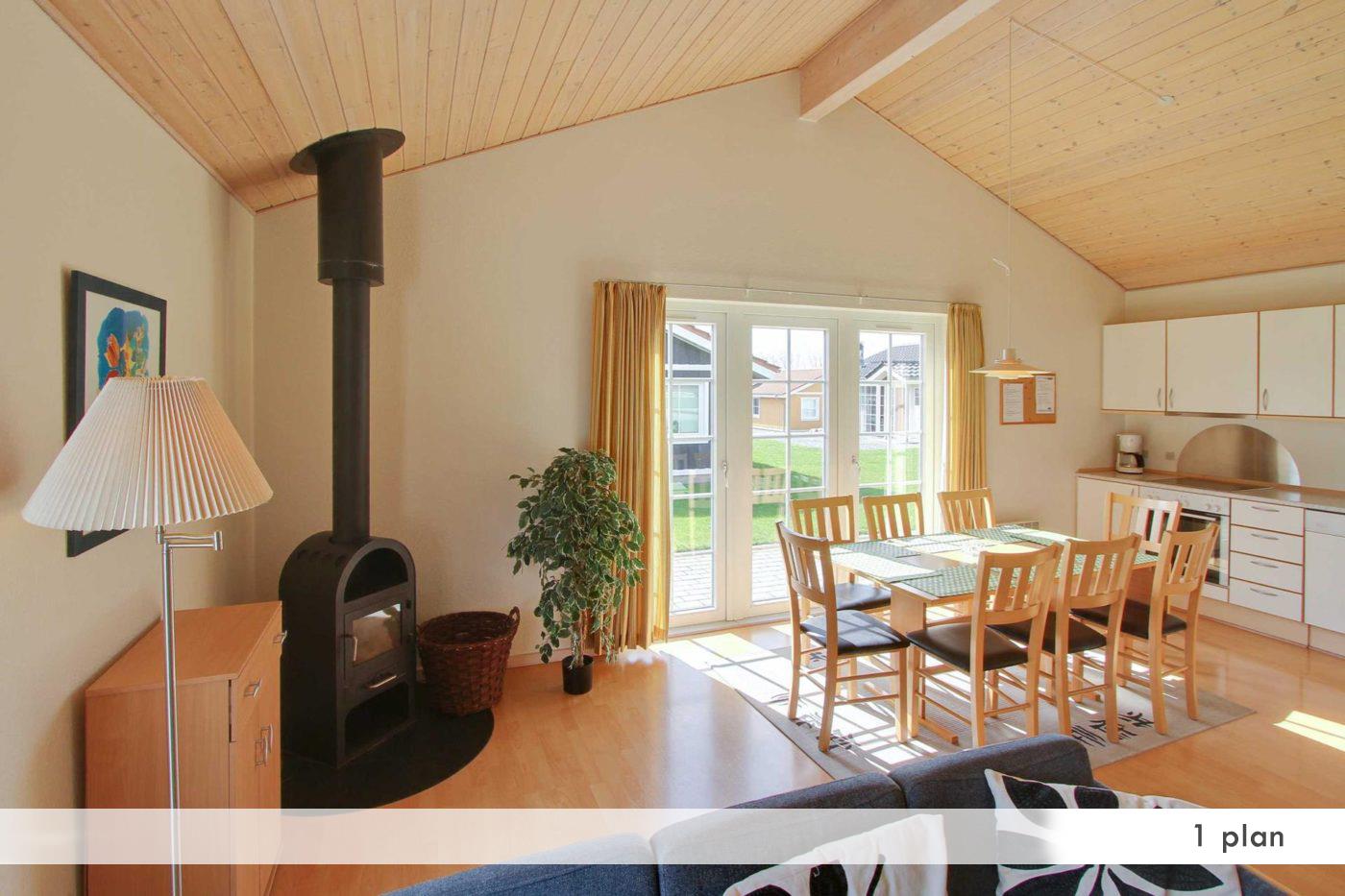 Stue med brændeovn, stereoanlæg, kabel-tv og video. Udgang til terasse.