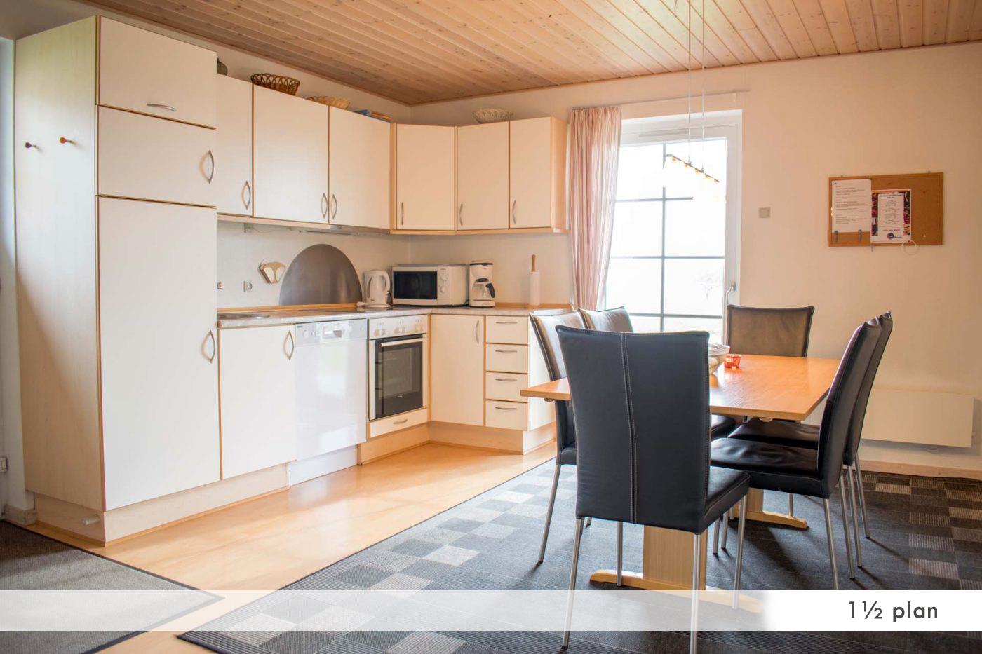 Åbent køkken med spiseplads, el-komfur, ovn, køleskab med frostboks, microovn, emhæte, kaffemaskine, opvaskemaskine.