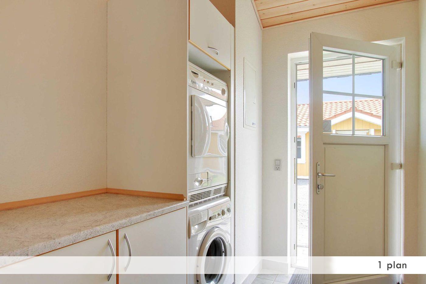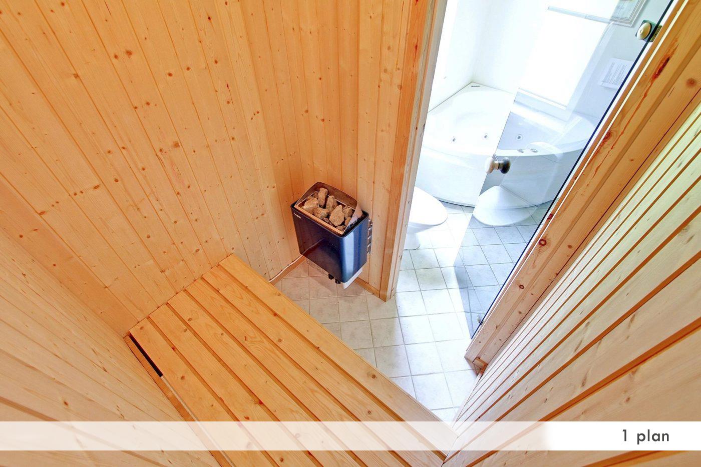 Badeværelse med spa, sauna og gulvvarme. Gæstetoilet. Vaskemaskine, tørretumbler, støvsuger.