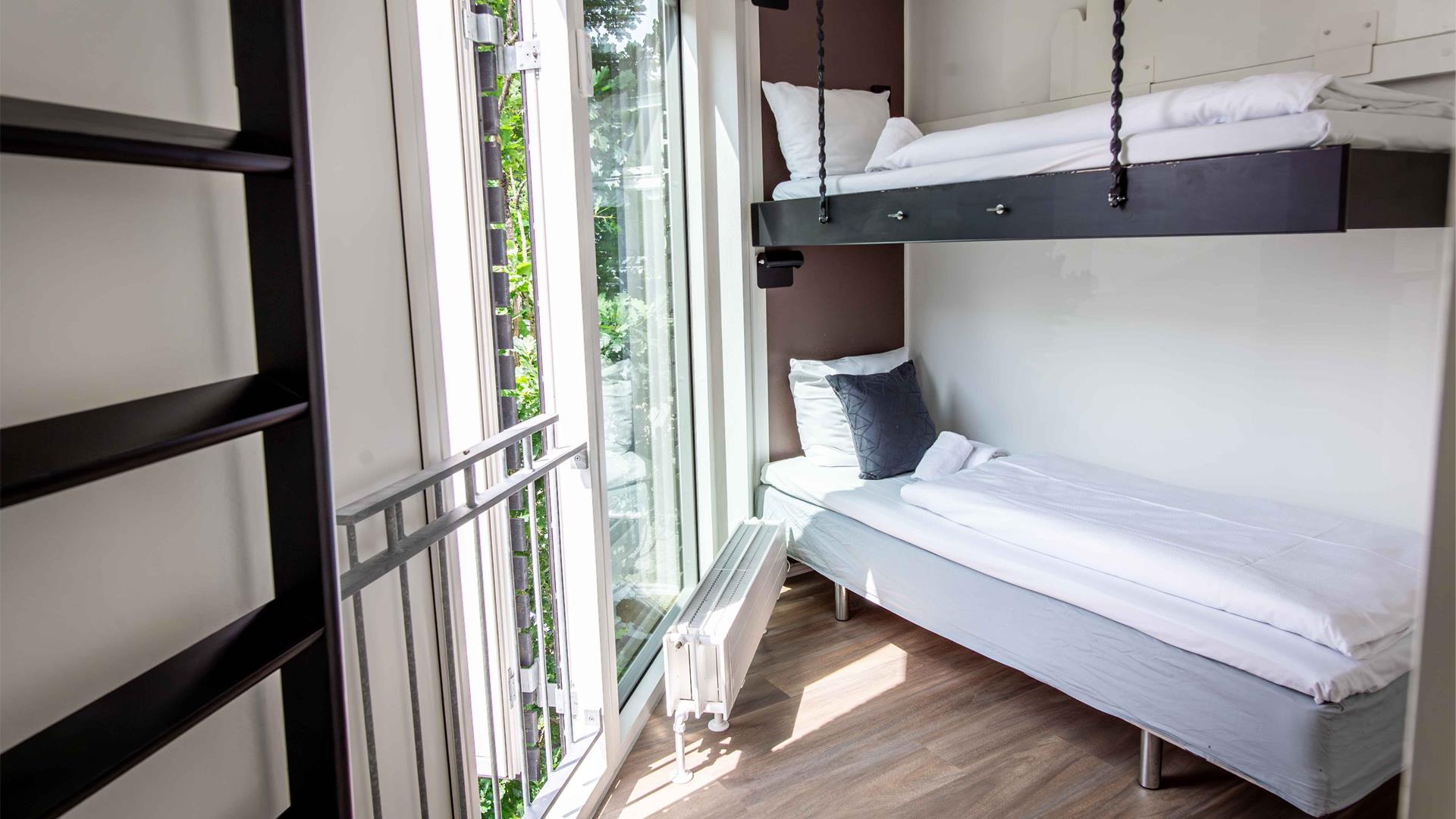 2 med hver 1 alm. enkeltseng + 1 væghængt seng (190 cm, anbefales til børn)