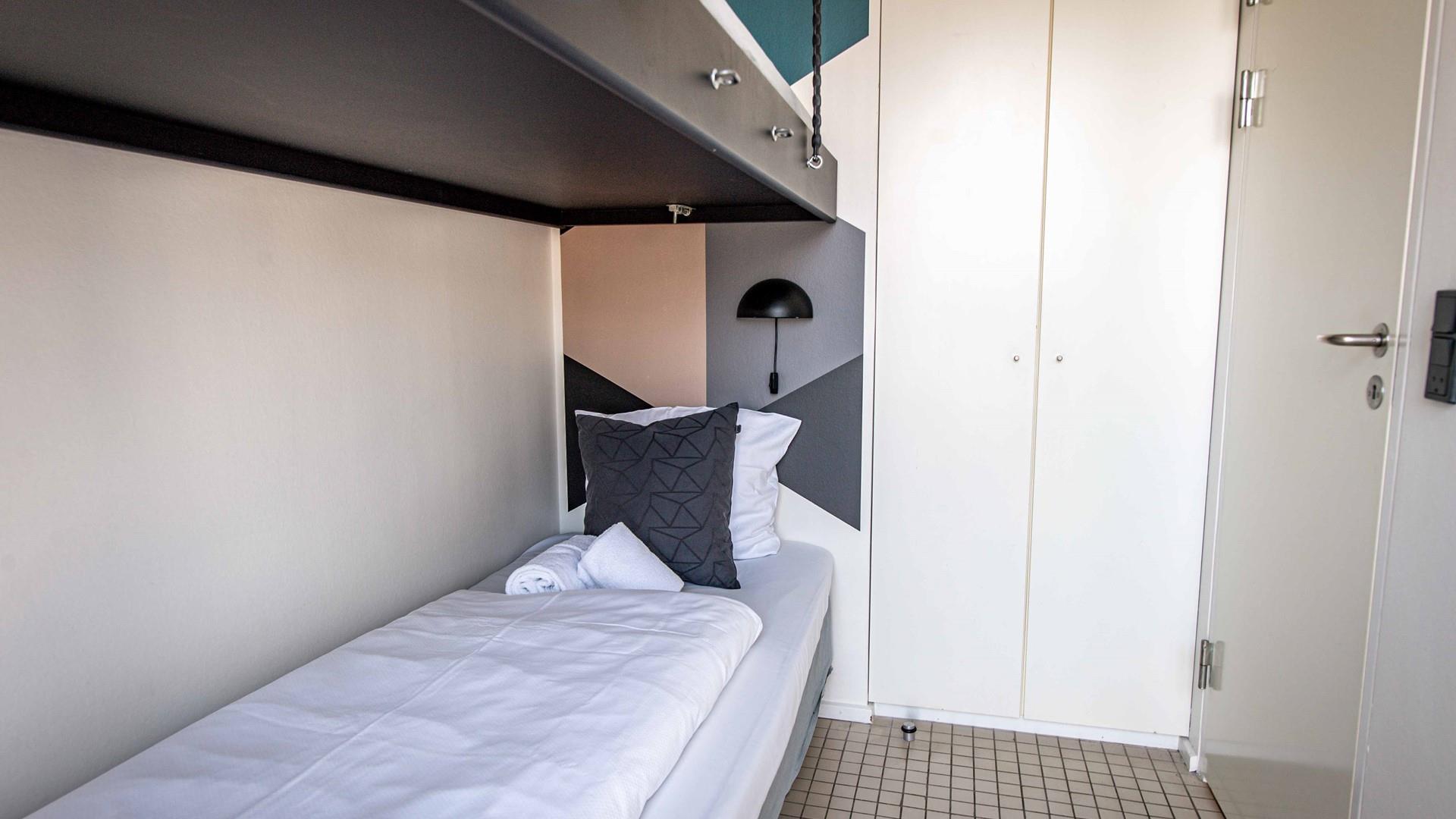 1 med 1 alm. enkeltseng + 1 væghængt seng (190 cm, anbefales til børn)