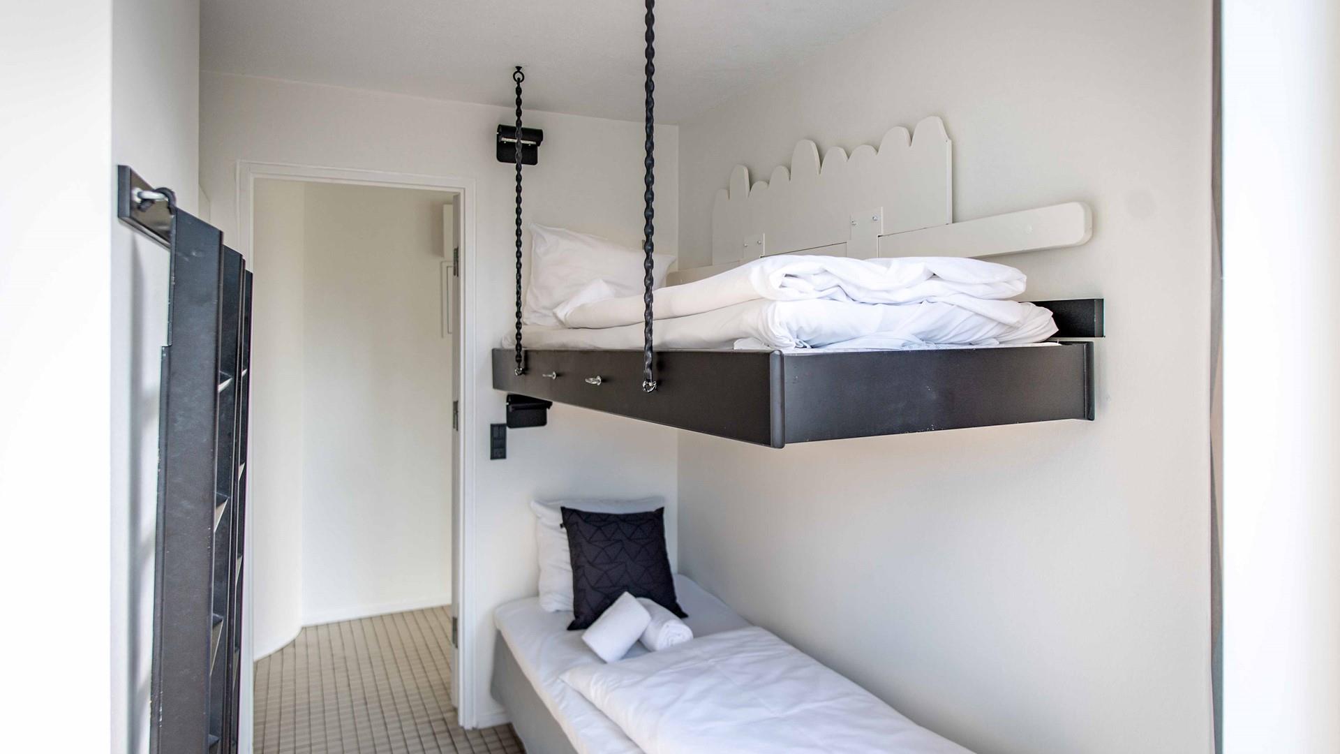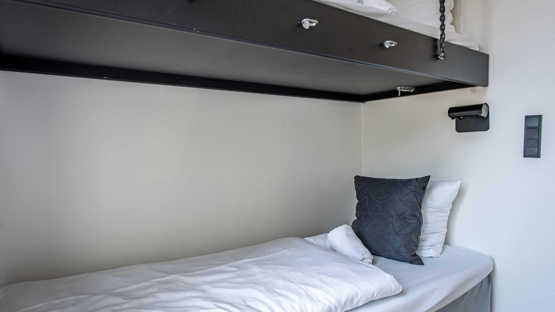 1 med 1 alm. enkeltseng + 1 væghængt seng (190 cm, anbefales til børn)