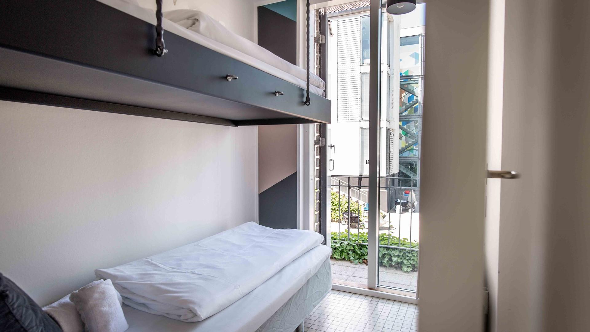 2 med hver 1 alm. enkeltseng + 1 væghængt seng (190 cm, anbefales til børn)