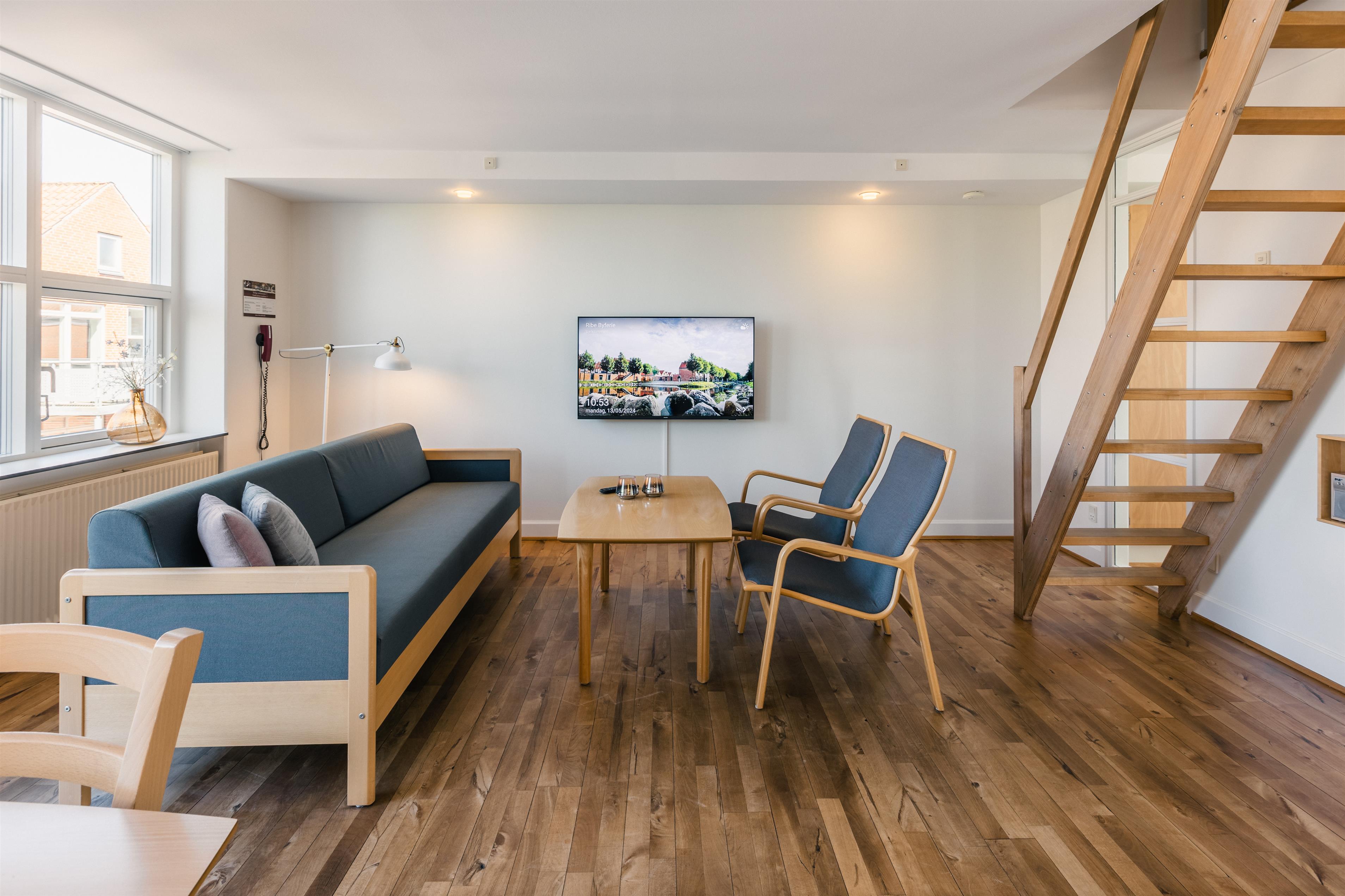 Stue med enkelt- eller dobbelt sovesofa, TV/radio og telefon.