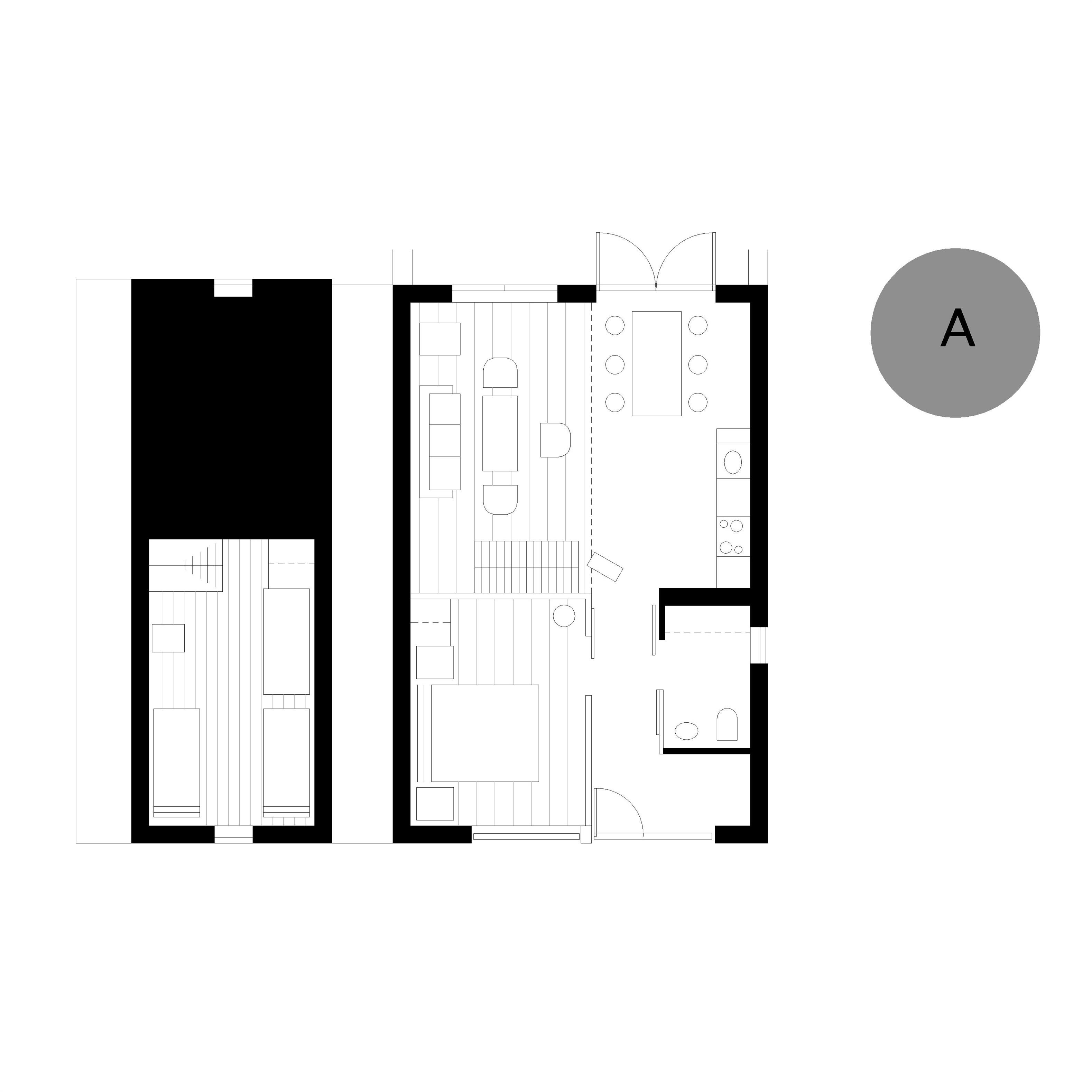 Entré, køkken, stue med sovesofa, badeværelse, soveværelse med dobbeltseng.