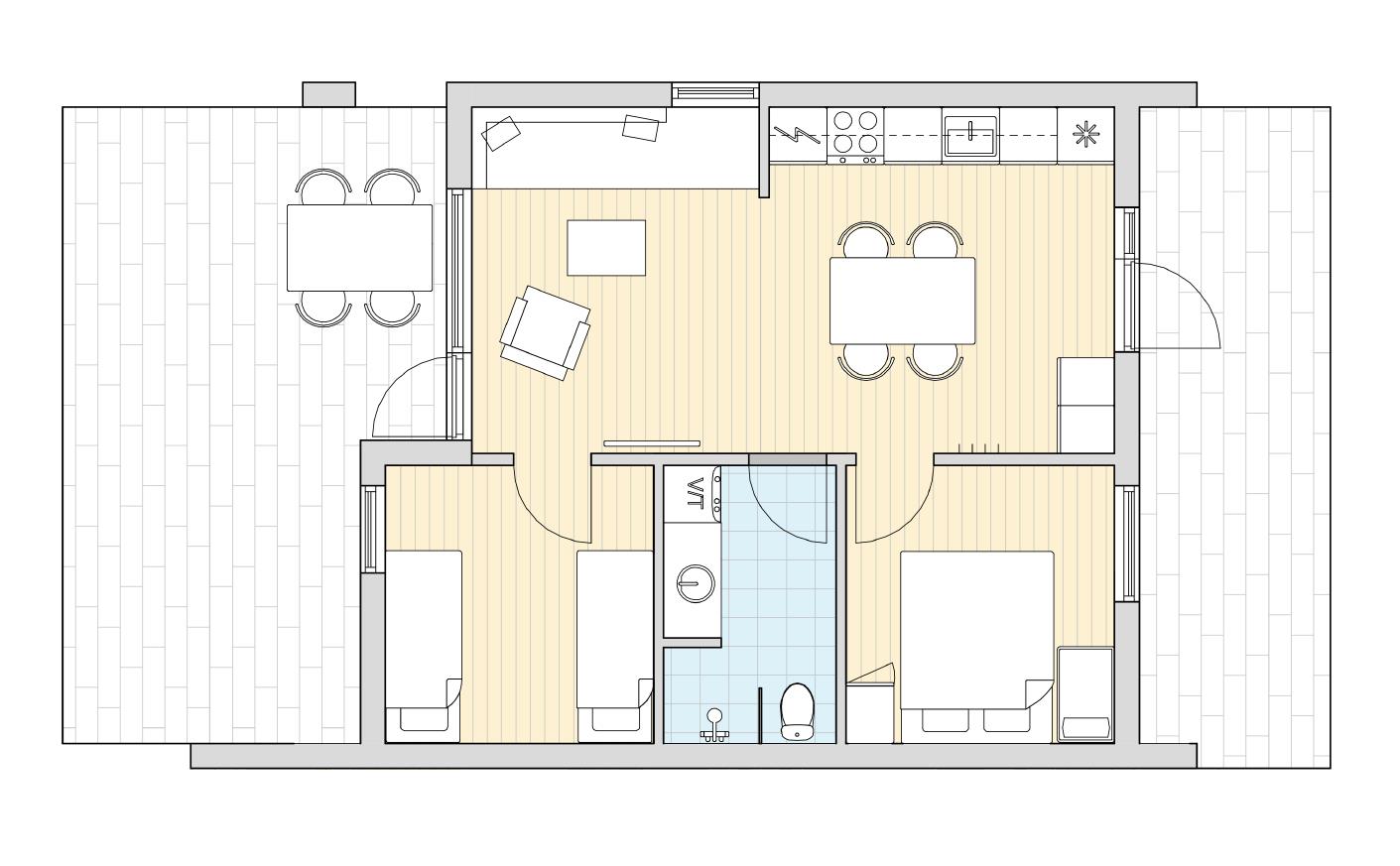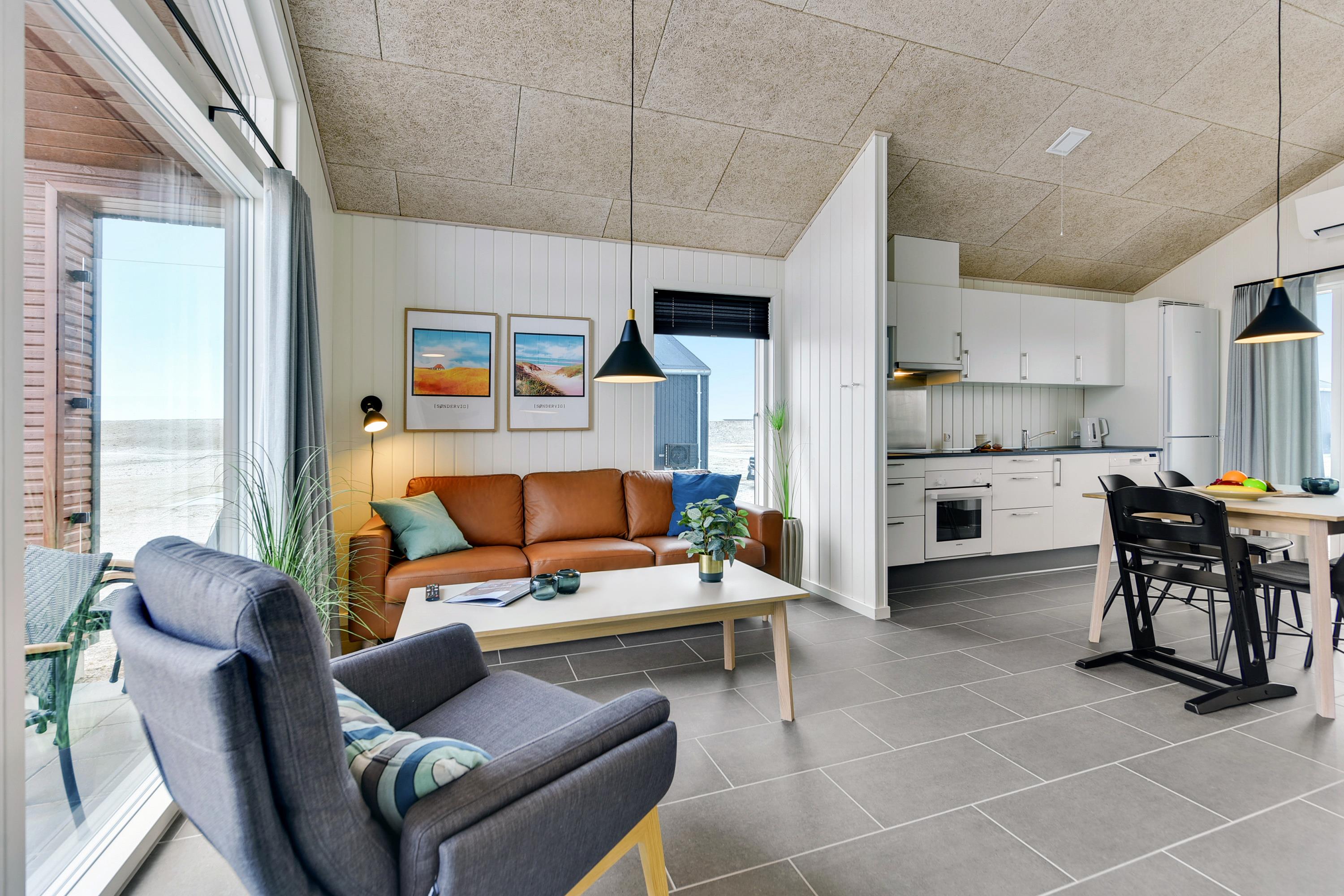 Dette feriehus på 55 m², er et dobbelthus og oplagt til familien på fire, som ønsker lidt mere plads. Det har to værelser, køkken/alrum og bad – og loftet går helt til kip, hvilket giver et flot lysindfald til hele huset.