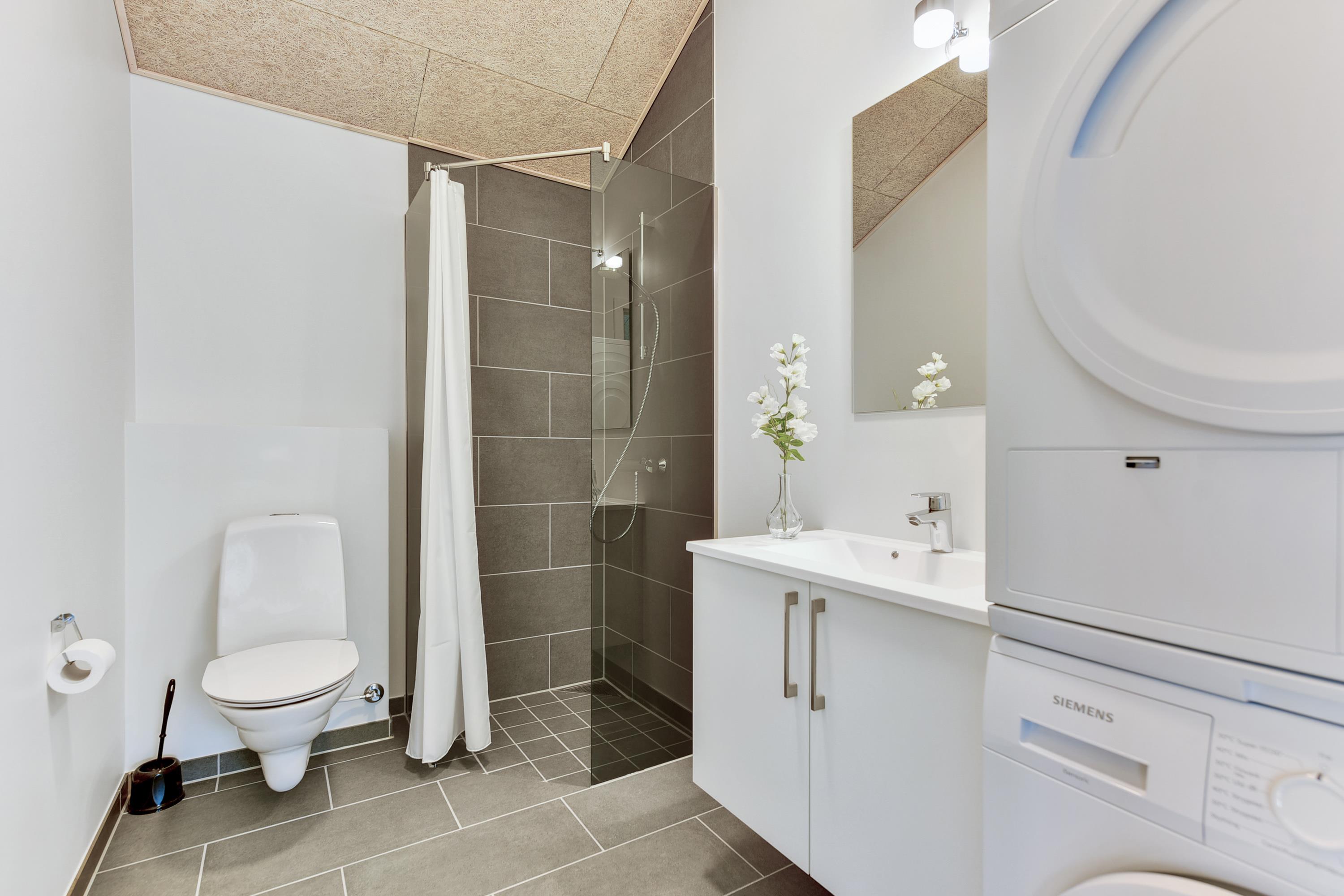 Badeværelse: WC, håndvask, bruseniche og vaskemaskine og tørretumbler