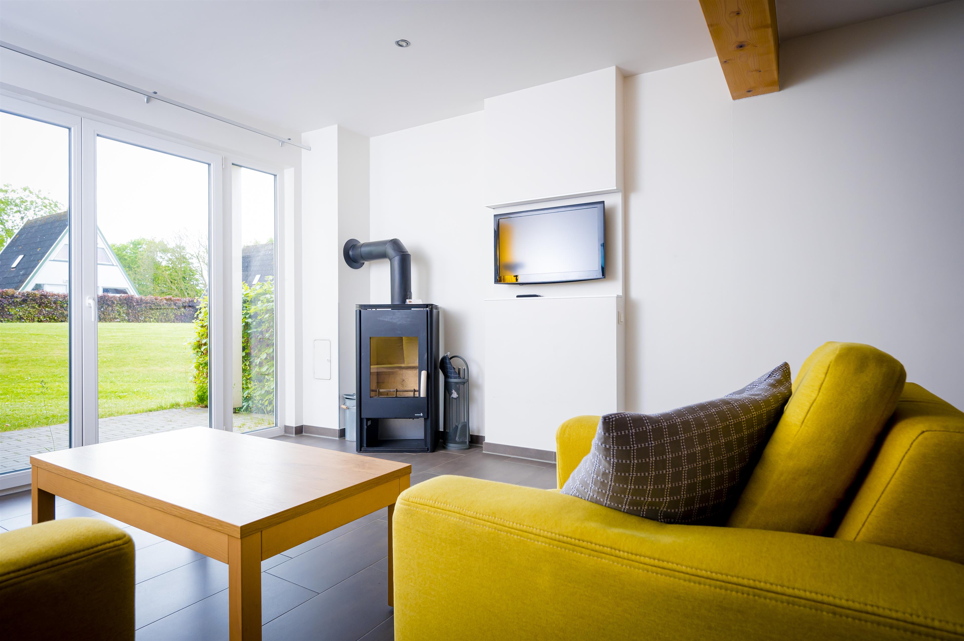 · Stue / spisestue med fladskærm med DR1 + DR2, brændeovn og sofahjørne – stueplan
